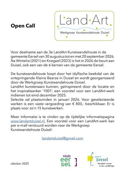 De gemeente Eersel organiseert in september 2026 een kunstwandelroute, ca 3 km, langs de Kleine Beerze in Duizel.