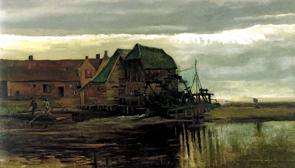 Het bouwwerk legt hij meermaals vast. Hij werkt aan het hierboven genoemde grote doek van de molen in het landschap en maakt ook een geschilderde close up van de raderen en tevens een aquarel. Tijdens Vincents verblijf in Nuenen draaien er twee raderen, waarbij het kleine rad fungeert voor het olieslaan. De molen staat in een beekdallandschap; de Dommel en de Tongelreep komen hier samen.