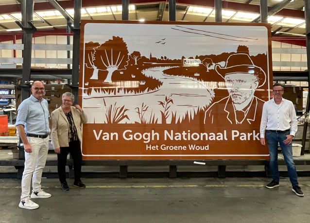 Afgelopen week hebben Désiré van Laarhoven namens Stichting Landschap het Groene Woud, Frank van den Eijnden namens Van Gogh Nationaal Park en de ontwerper van de borden Tomas Snels het eindresultaat in de fabricatiehal van AGMI uit Tegelen bekeken. Désiré van Laarhoven is onder de indruk van de borden: “Het iconische landschap van de Dommel in combinatie met het portret van Van Gogh is een visitekaartje voor heel Brabant”. Frank van den Eijnden is blij dat nu de eerste borden kunnen worden geplaatst en verwacht dat komend jaar ook de borden voor de Loonse en Drunense Duinen kunnen worden geplaatst: ”Van Gogh Nationaal Park is een groot gebied waar Vincent van Gogh opgroeide en waarin bijna 80 partners samen werken aan vergroening tot in het hart van steden en dorpen. Een park van betekenis voor de leefbaarheid van de provincie, dat mag ook aan de buitenkant gezien worden”.